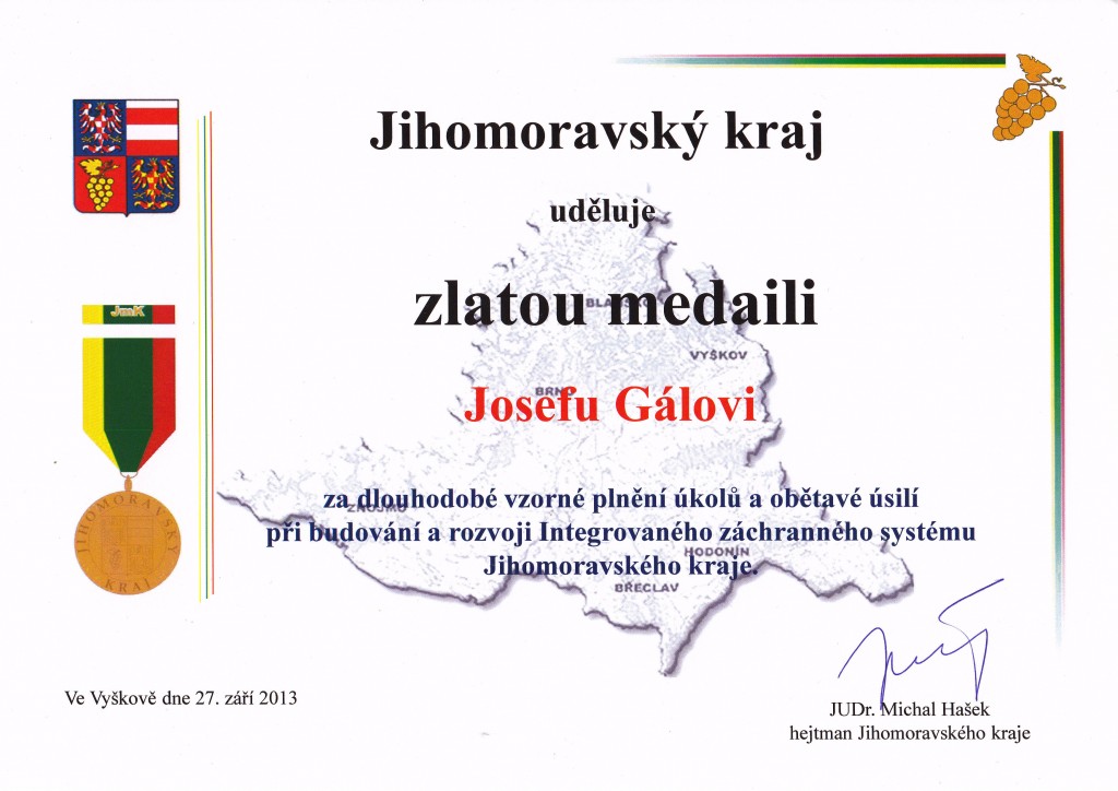 V průběhu své návštěvy Jihomoravského kraje se v pátek dne 27. září 2013 setkali prezident republiky a jihomoravský hejtman v Besedním domě ve Vyškově s dobrovolnými hasiči, záchranáři, pracovníky Českého červeného kříže a dalších složek Integrovaného záchranného systému. Poděkovali jim za jejich osobní obětavost při zajišťování bezpečnosti spoluobčanů formou prevence, ale i při zásazích při požárech, dopravních nehodách a krizových situacích spojených s poskytováním neodkladné první pomoci a záchranou lidského života. Při této příležitosti převzalo z rukou prezidenta Miloše Zemana a hejtmana Michala Haška ocenění 12 profesionálů a 38 dobrovolníků. Mezi oceněnými byl i člen SDH Tvrdonice, starosta Okresního sdružení hasičů Břeclav, Josef Gál, který převzal Zlatou medaili Jihomoravského kraje za dlouholeté vzorné plnění úkolů a obětavé úsilí při budování a rozvoji Integrovaného záchranného systému Jihomoravského kraje.